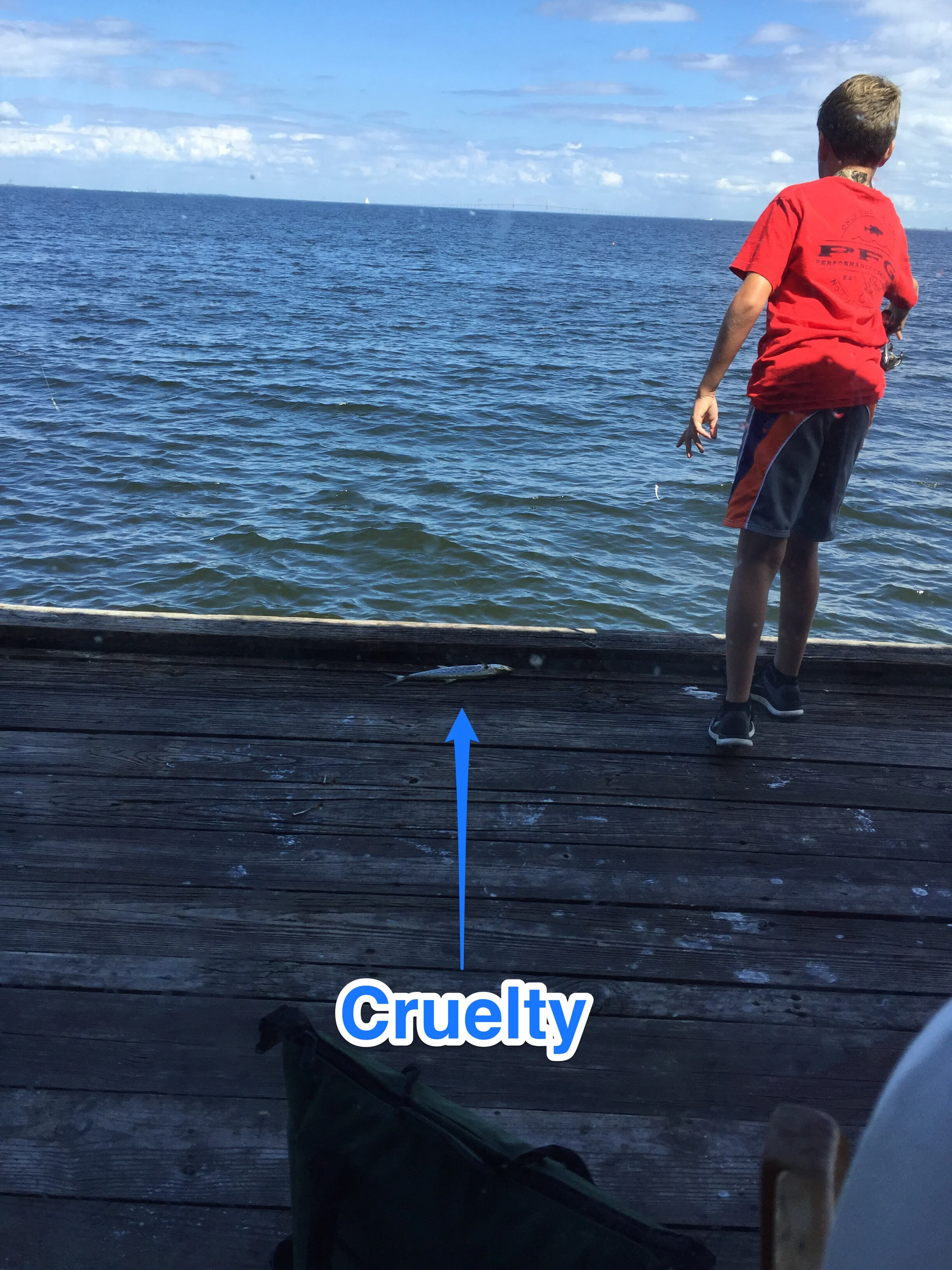 We saw a man and a boy fishing together, right in front of us. The man hooked a fish, reeled it in, cut the line, and dropped it to the pier. This is where my contemplation on cruelty comes from.