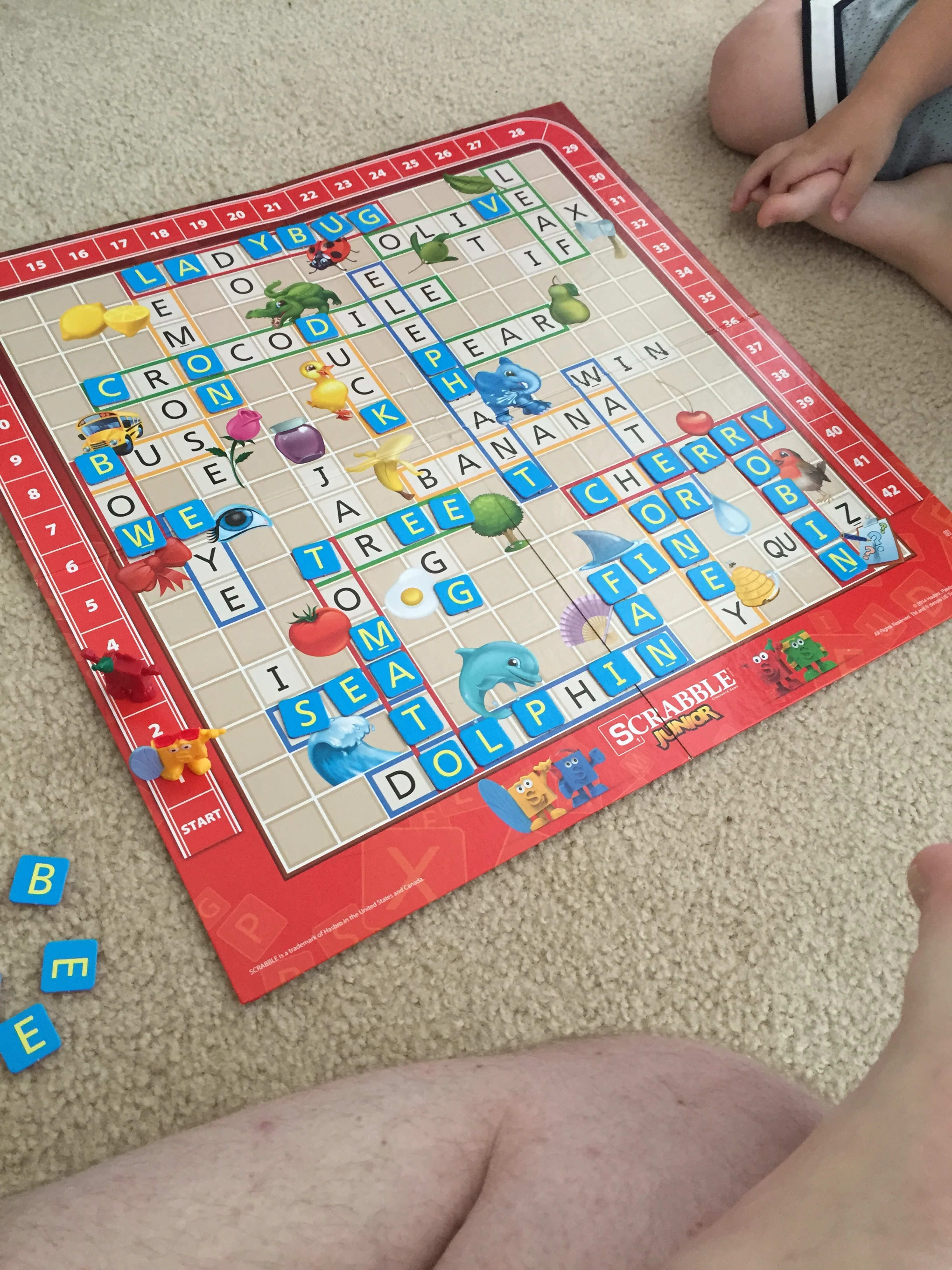 I was pleasant surprised by just how much Cap already knows. He's very clear on his consonants versus vowels, and he was able to read the words on the board without much help on my part. Once I showed him the tactical advantage to looking for words he could complete, especially words of his own color (which give two points in Scrabble Junior), he was on the case.