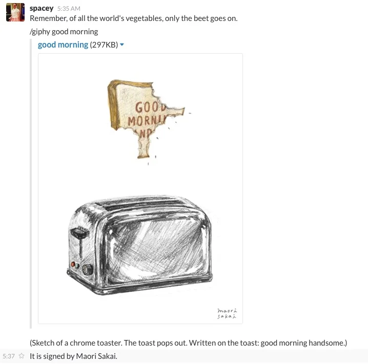 It's awesome. It's kind. It's naturally inclusive. It's also sort of game even now. People will rush to do the captioning, and when they're done, other folks will add slack "reactions" to the caption, showing their love and approval.