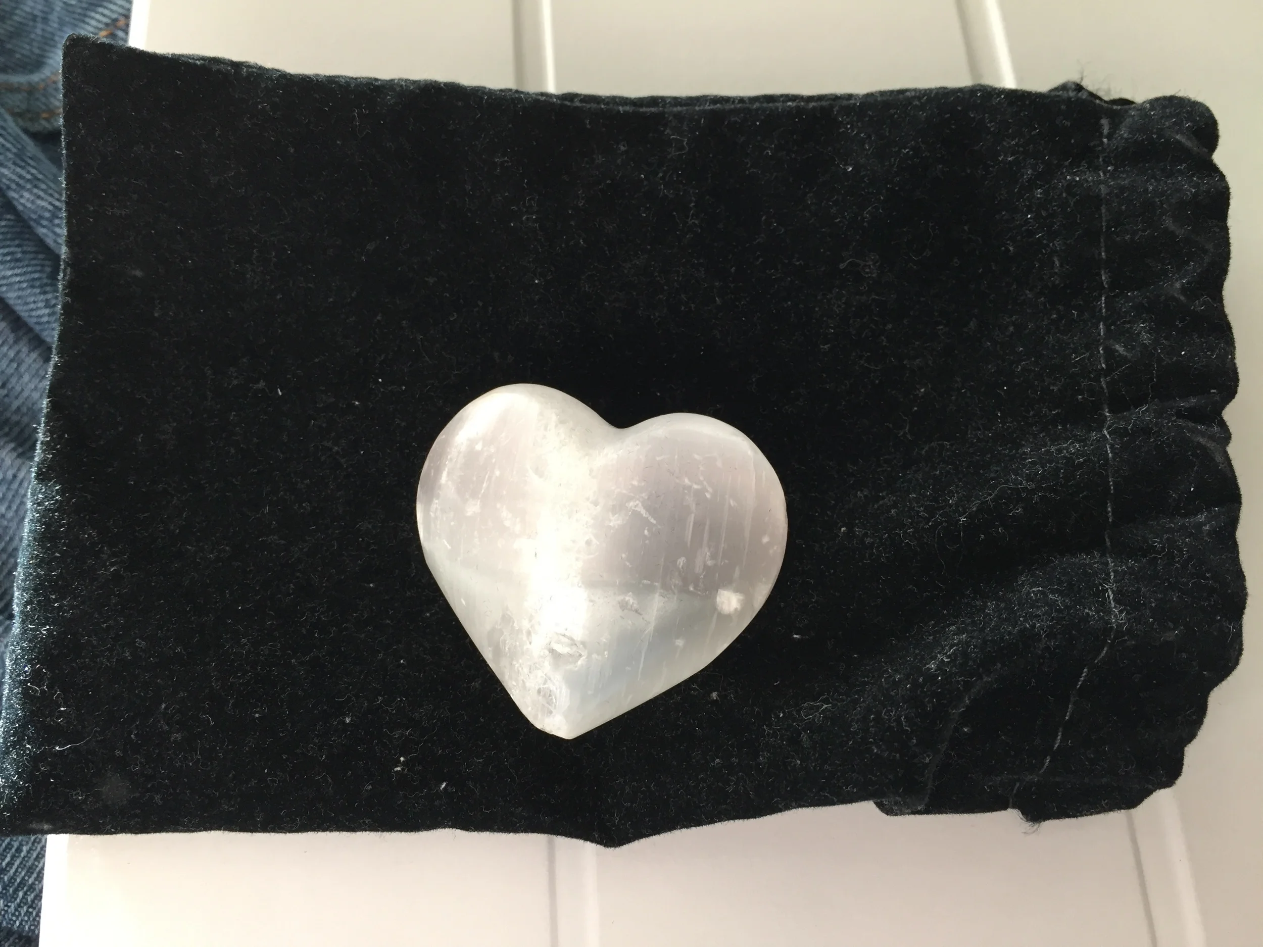 No, seriously. Here you can see it. It's a crystal heart, made out of selenite. I took it in its little velvet pouch and stuck it in my pocket, warming it with my body as we went about our day.