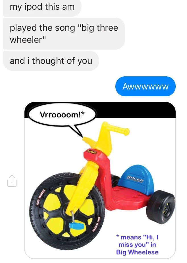 I randomly messaged her yesterday, and she told me I'd already been on her mind that day. She heard a song about racing a big wheel and it got her thinking of me.