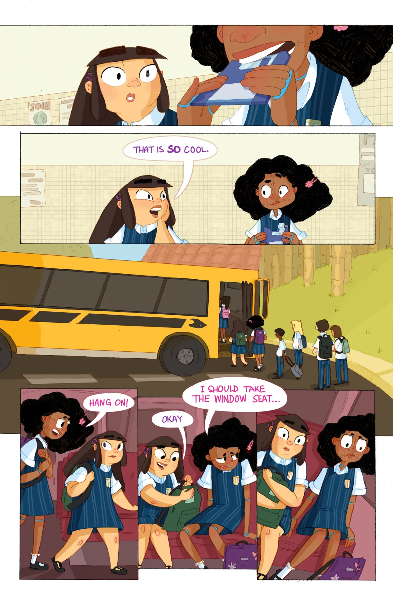 It's about a robot girl, going to a new school, and feeling socially awkward, and alone, until she makes a friend. Here's a page from it.