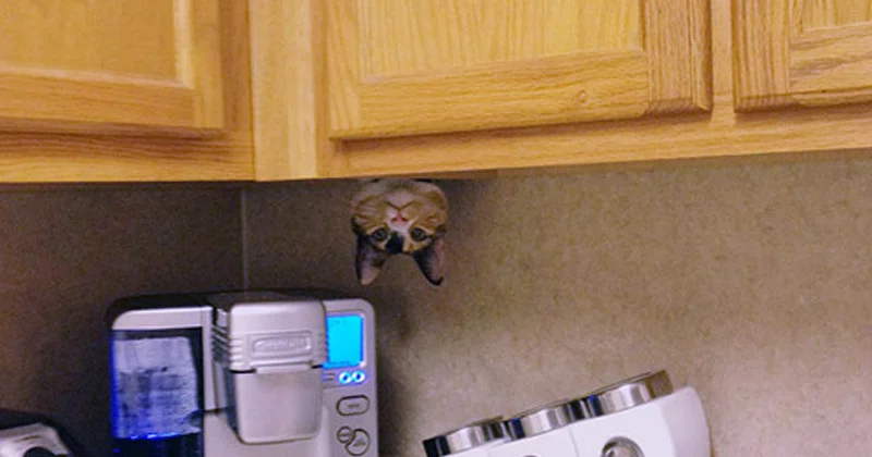 Somehow this little guy got into the kitchen cabinets, and is hanging UPSIDE DOWN out the bottom of one. Hysterical!